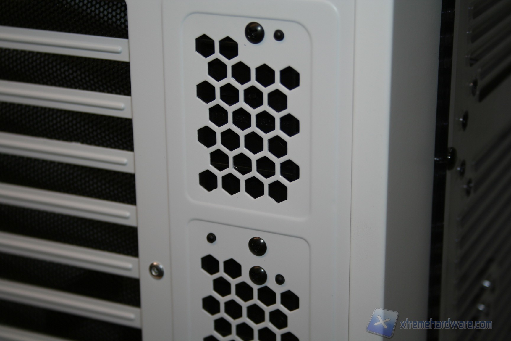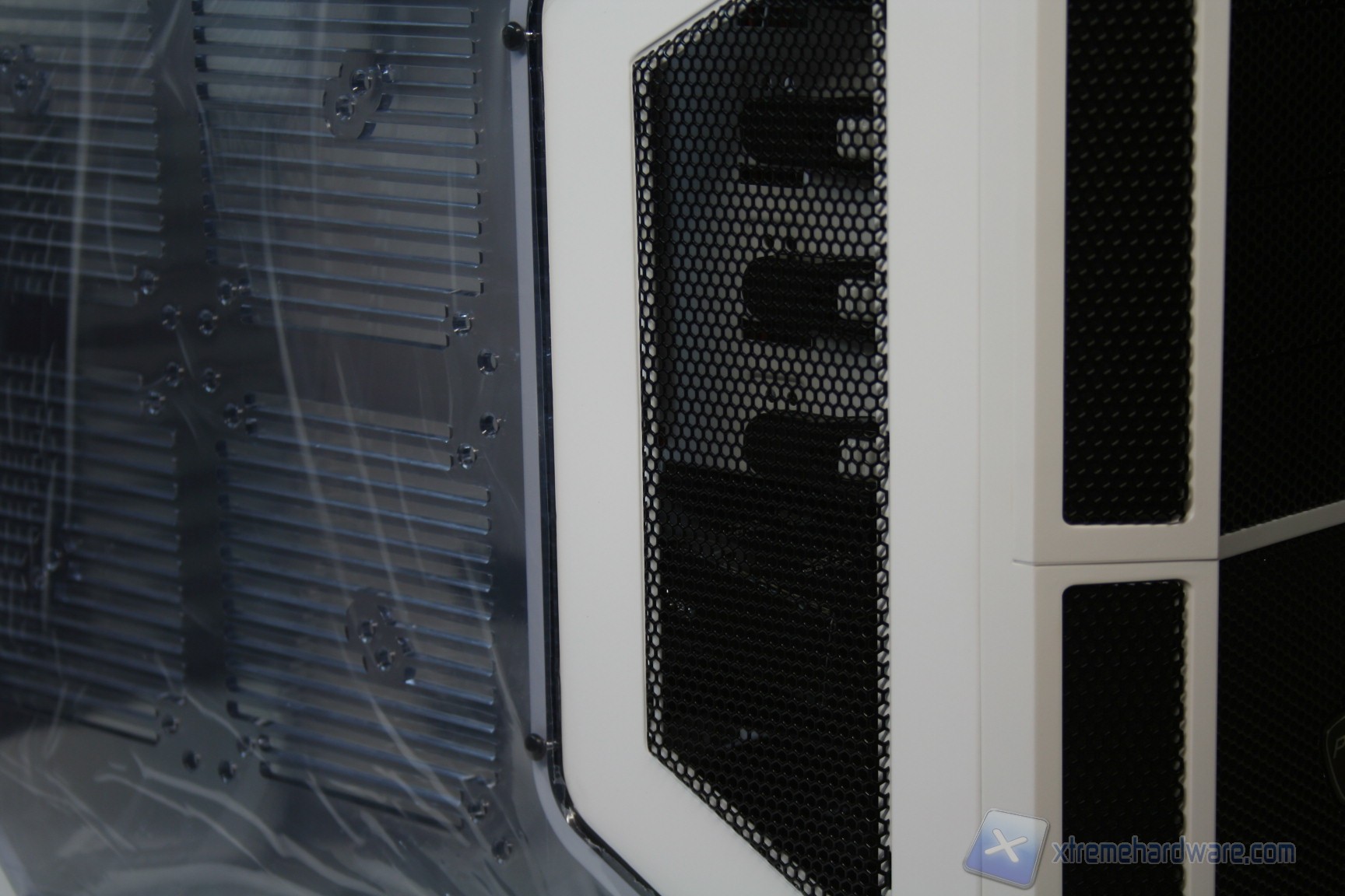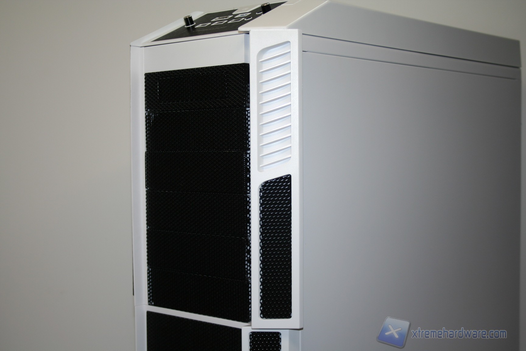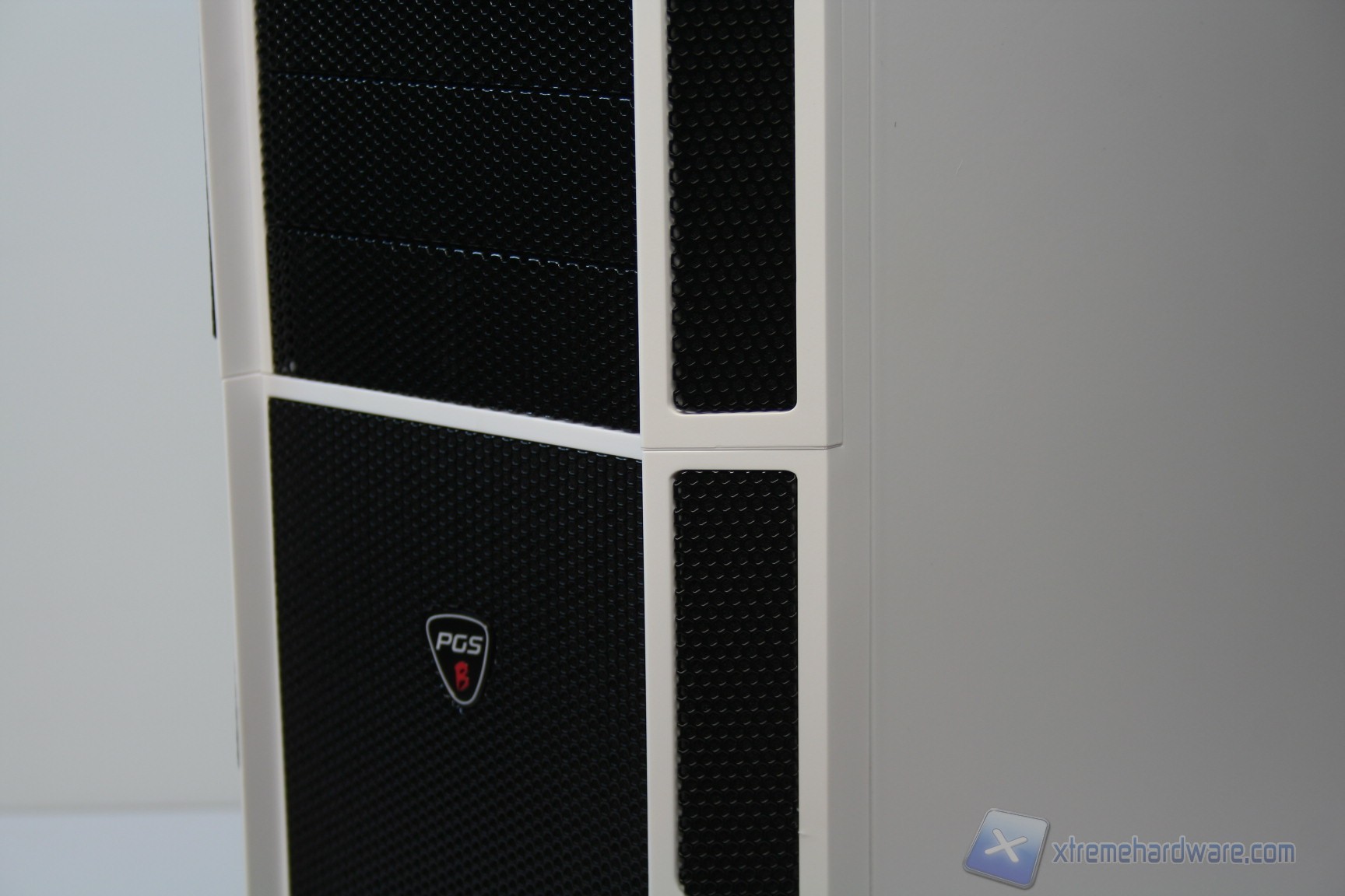 Lateralmente il cabinet presenta un sistema ibrido tra una paratia in plexiglass ed una classica griglia di ventilazione, infatti questo sistema permette di abbinare una gradevole estetica, come vedremo, alla massima efficacia in termini di dissipazione termica perché è possibile installare un gran quantitativo di ventole, ben 4 da 120/140mm oppure una singola da 180/200mm. E’ presente inoltre, davanti ai bay degli hard disk, una fessura di ventilazione in mesh, di colore nero. Nelle aperture non sono presenti filtri antipolvere, con tutte le conseguenze del caso. La tipologia dei pannelli è in acciaio, la colorazione è bianca, la finitura è ottima e la solidità è davvero esemplare. Vogliamo precisare però che forse la chiusura, o la rimozione degli stessi, forse a causa dello strato di vernice bianca sulle giunzioni, risulta scomodo perché bisogna applicare molta forza per rimuoverli. La paratia laterale destra invece è uniforme, di colore bianco.