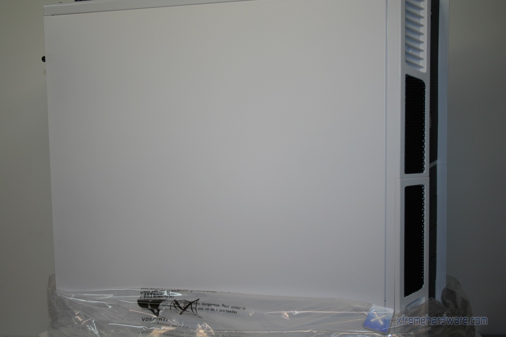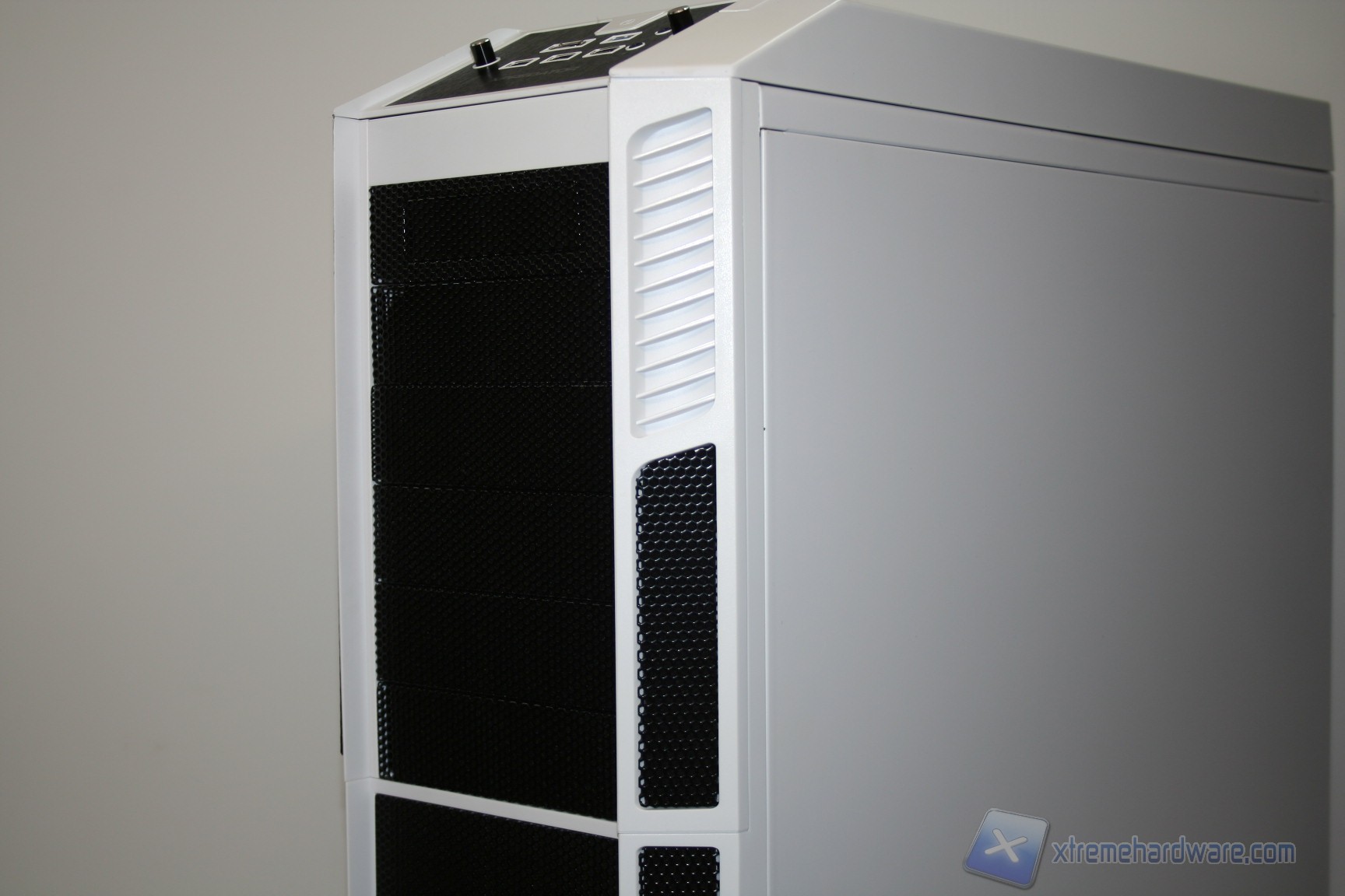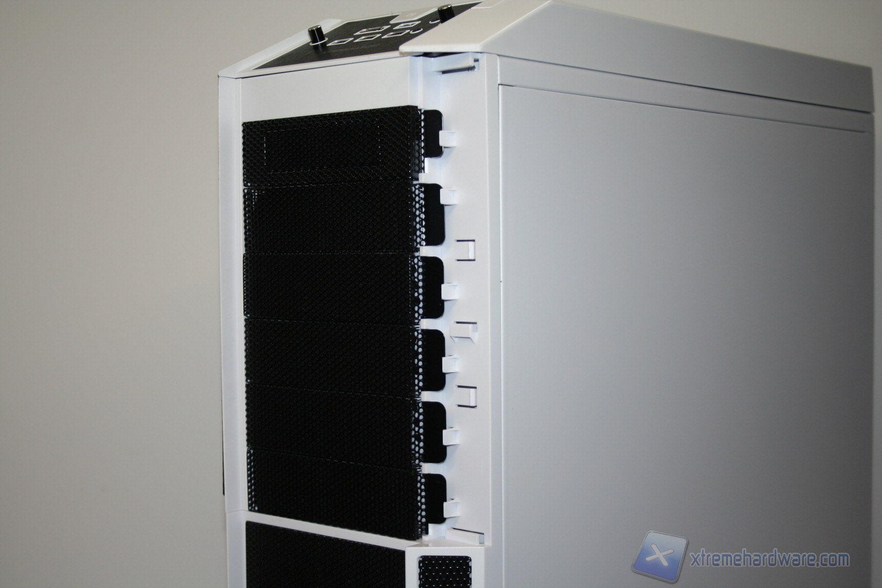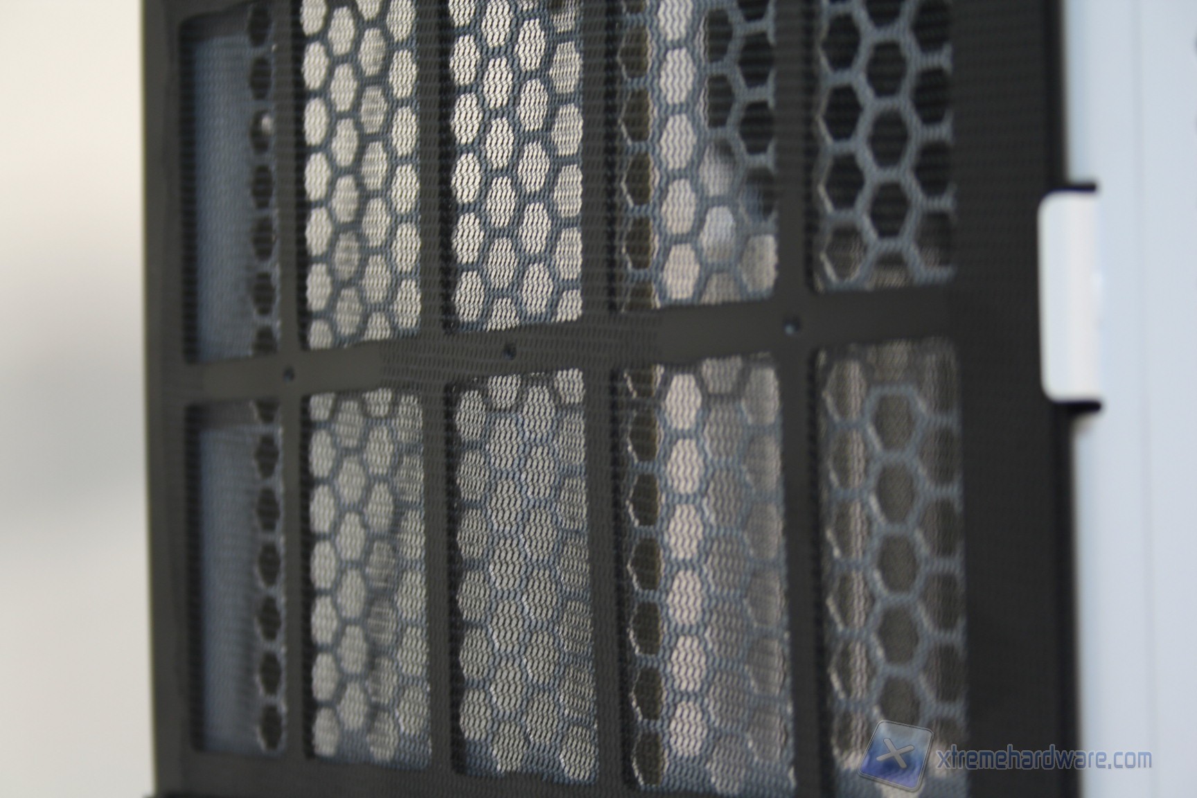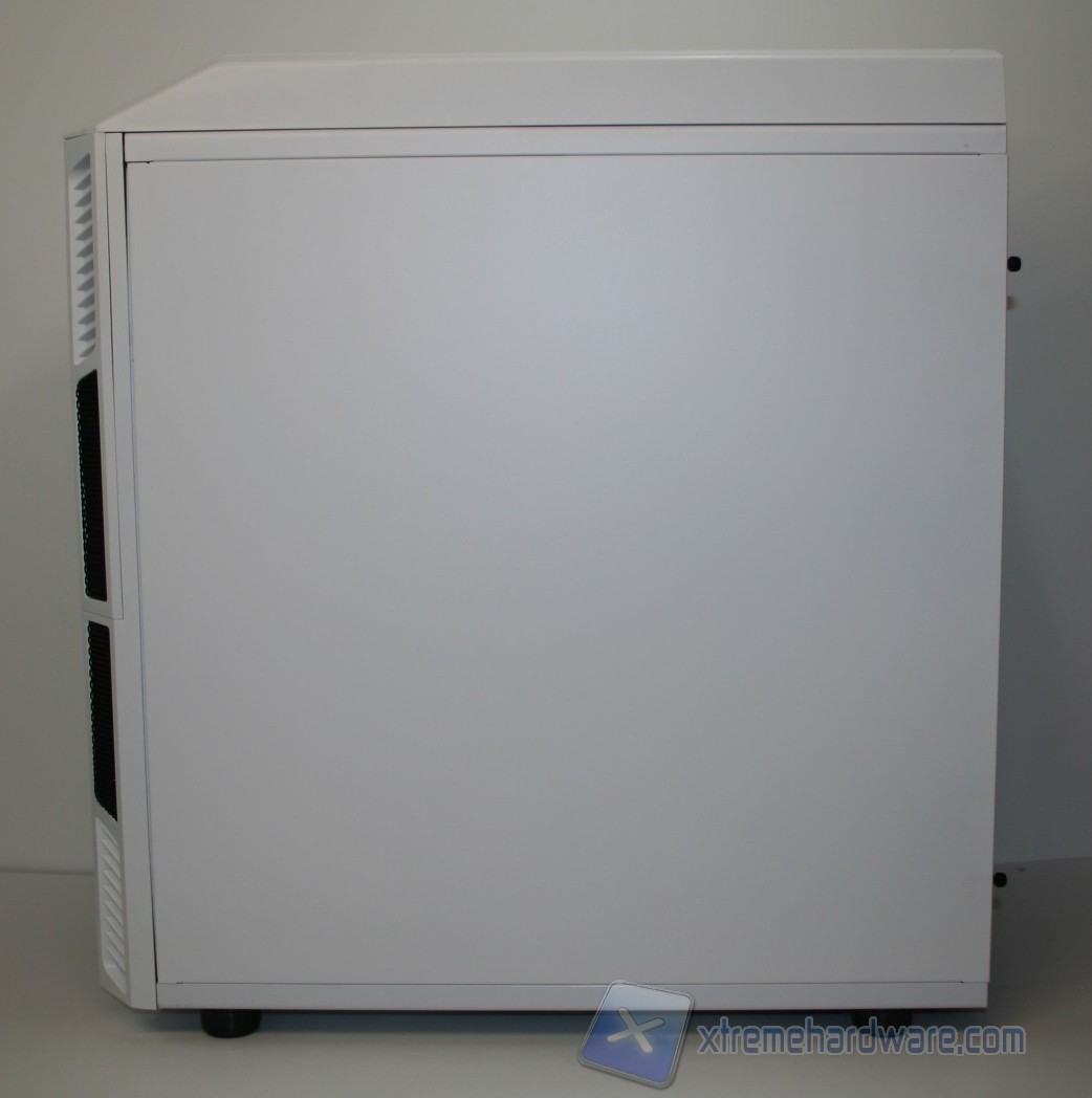 Lateralmente il cabinet presenta un sistema ibrido tra una paratia in plexiglass ed una classica griglia di ventilazione, infatti questo sistema permette di abbinare una gradevole estetica, come vedremo, alla massima efficacia in termini di dissipazione termica perché è possibile installare un gran quantitativo di ventole, ben 4 da 120/140mm oppure una singola da 180/200mm. E’ presente inoltre, davanti ai bay degli hard disk, una fessura di ventilazione in mesh, di colore nero. Nelle aperture non sono presenti filtri antipolvere, con tutte le conseguenze del caso. La tipologia dei pannelli è in acciaio, la colorazione è bianca, la finitura è ottima e la solidità è davvero esemplare. Vogliamo precisare però che forse la chiusura, o la rimozione degli stessi, forse a causa dello strato di vernice bianca sulle giunzioni, risulta scomodo perché bisogna applicare molta forza per rimuoverli. La paratia laterale destra invece è uniforme, di colore bianco.