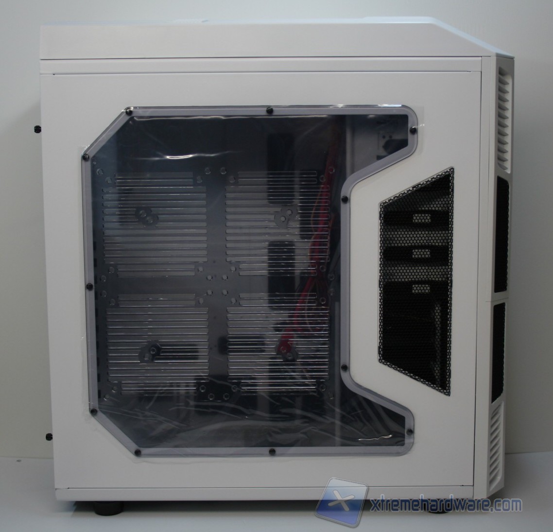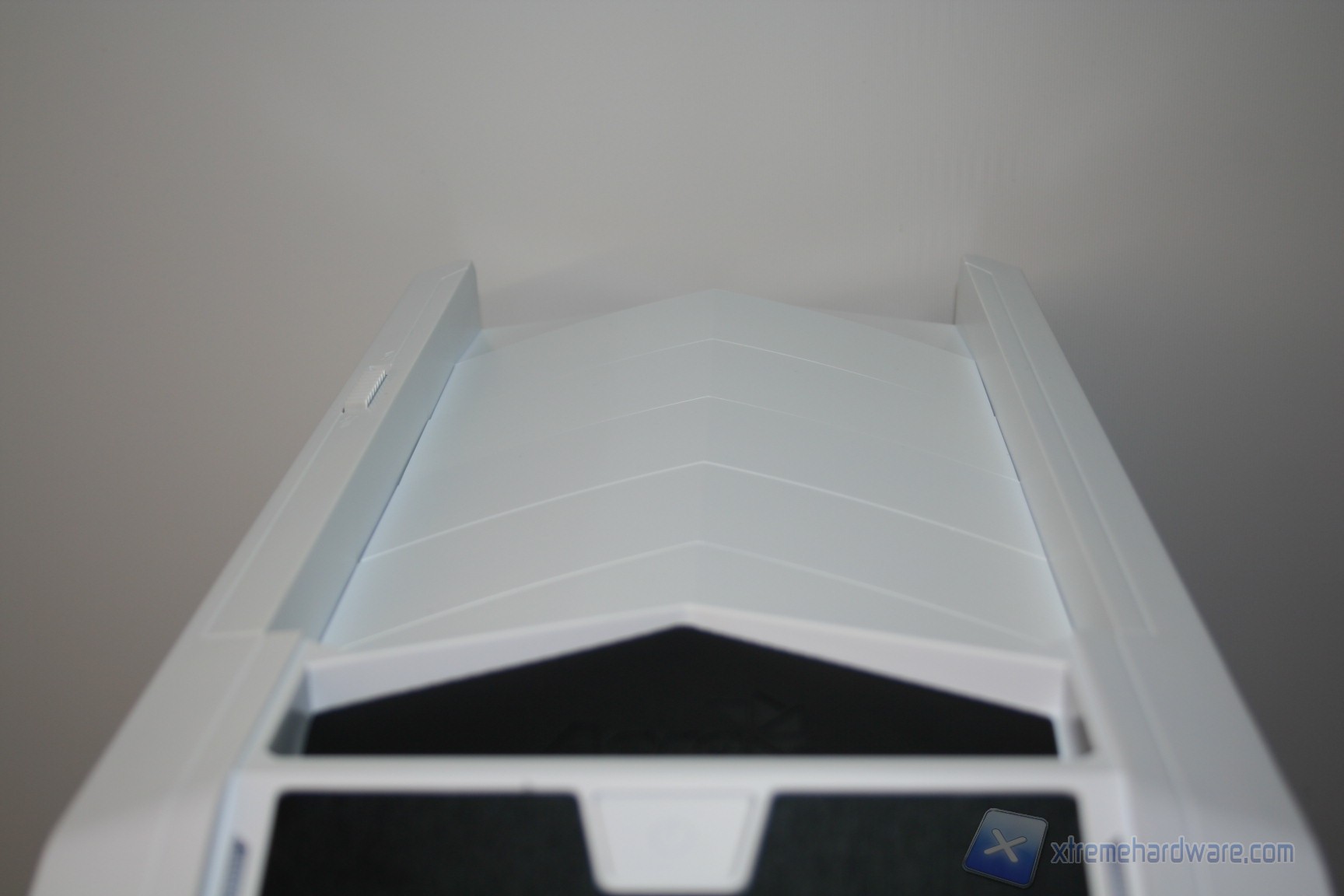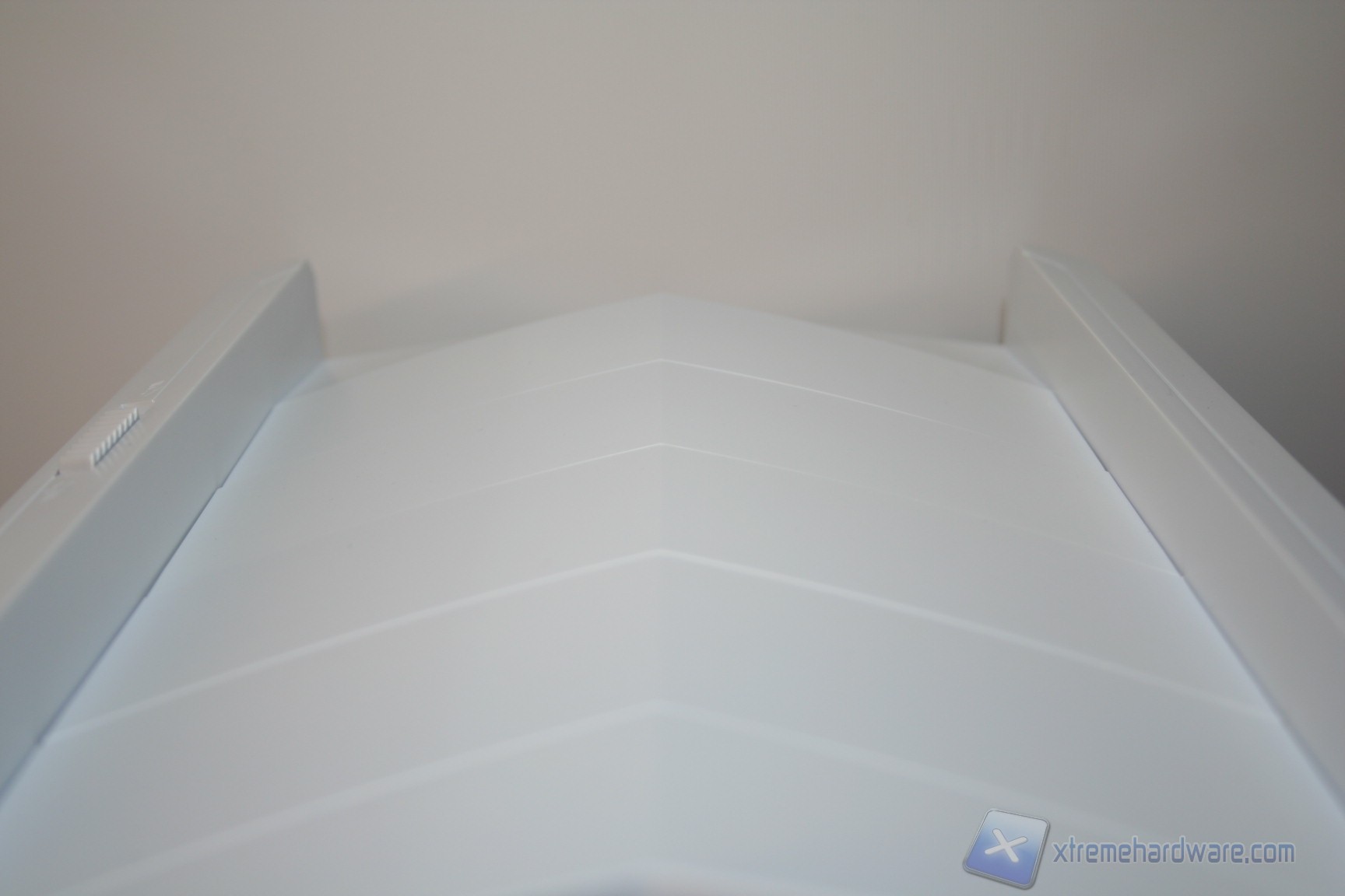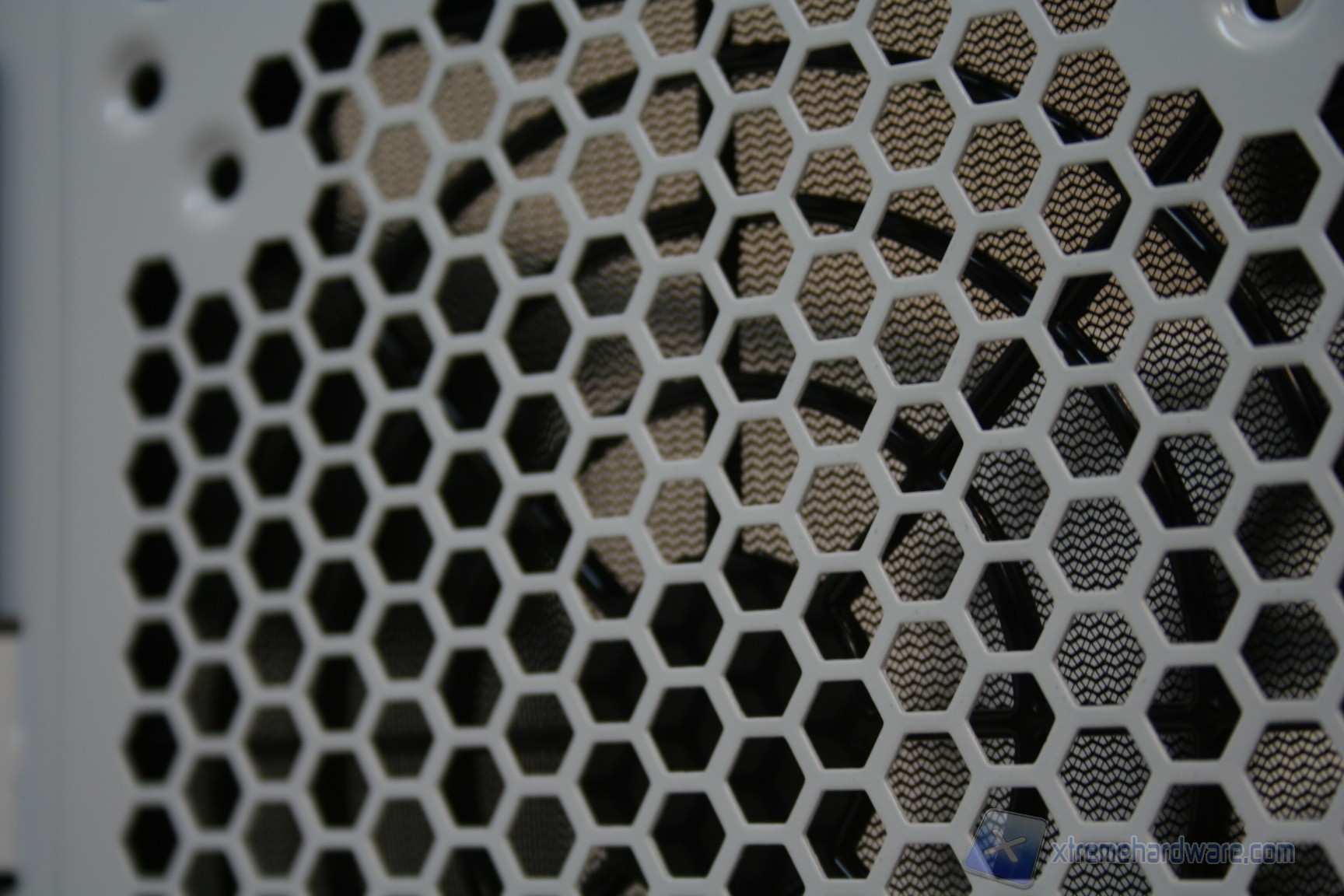 Lateralmente il cabinet presenta un sistema ibrido tra una paratia in plexiglass ed una classica griglia di ventilazione, infatti questo sistema permette di abbinare una gradevole estetica, come vedremo, alla massima efficacia in termini di dissipazione termica perché è possibile installare un gran quantitativo di ventole, ben 4 da 120/140mm oppure una singola da 180/200mm. E’ presente inoltre, davanti ai bay degli hard disk, una fessura di ventilazione in mesh, di colore nero. Nelle aperture non sono presenti filtri antipolvere, con tutte le conseguenze del caso. La tipologia dei pannelli è in acciaio, la colorazione è bianca, la finitura è ottima e la solidità è davvero esemplare. Vogliamo precisare però che forse la chiusura, o la rimozione degli stessi, forse a causa dello strato di vernice bianca sulle giunzioni, risulta scomodo perché bisogna applicare molta forza per rimuoverli. La paratia laterale destra invece è uniforme, di colore bianco.