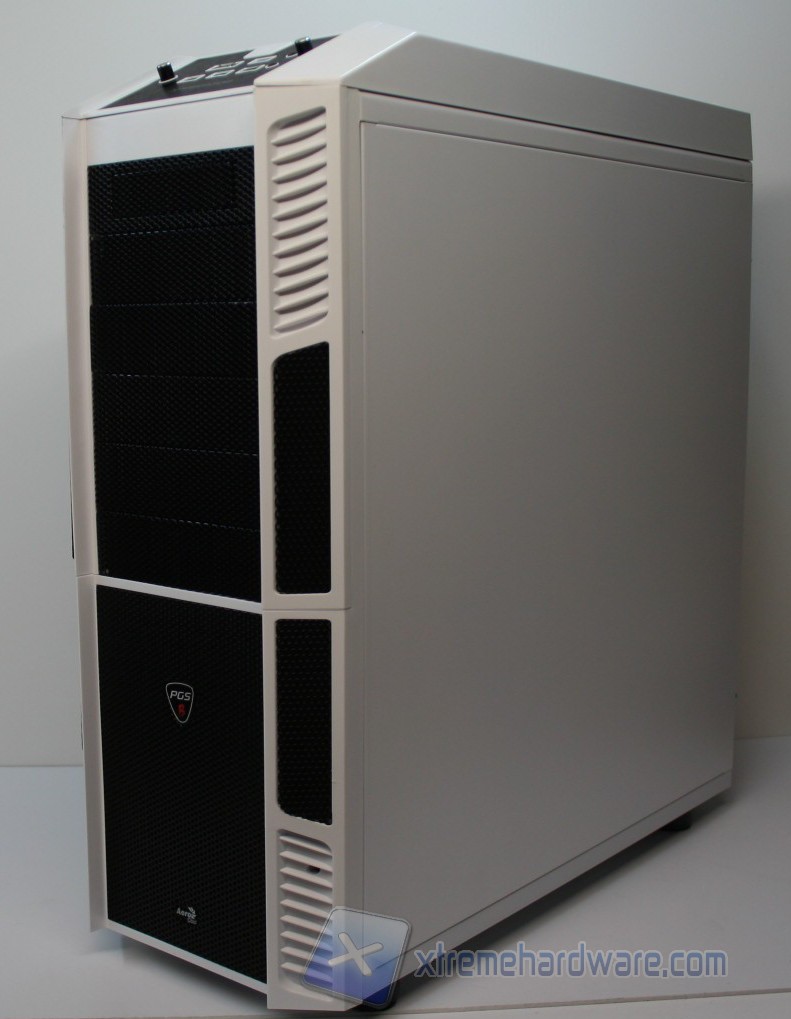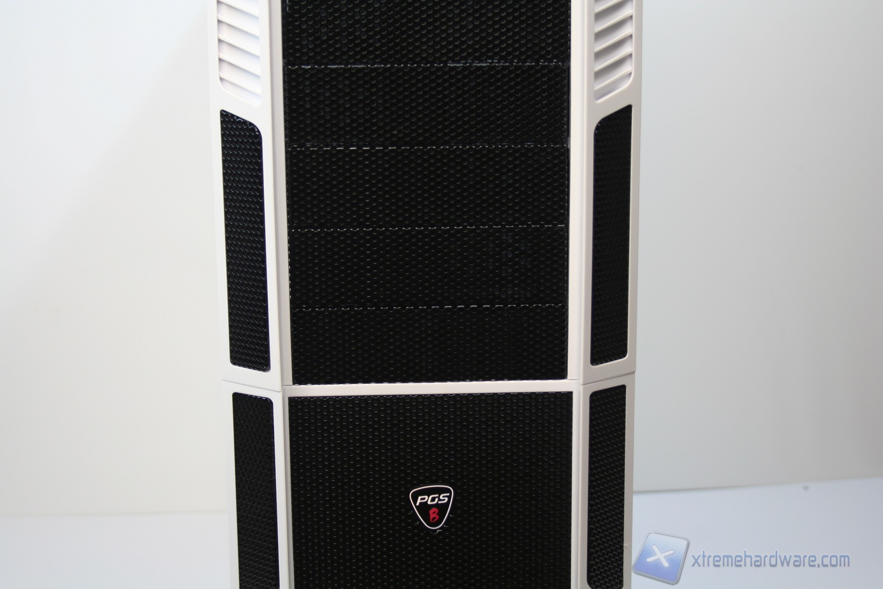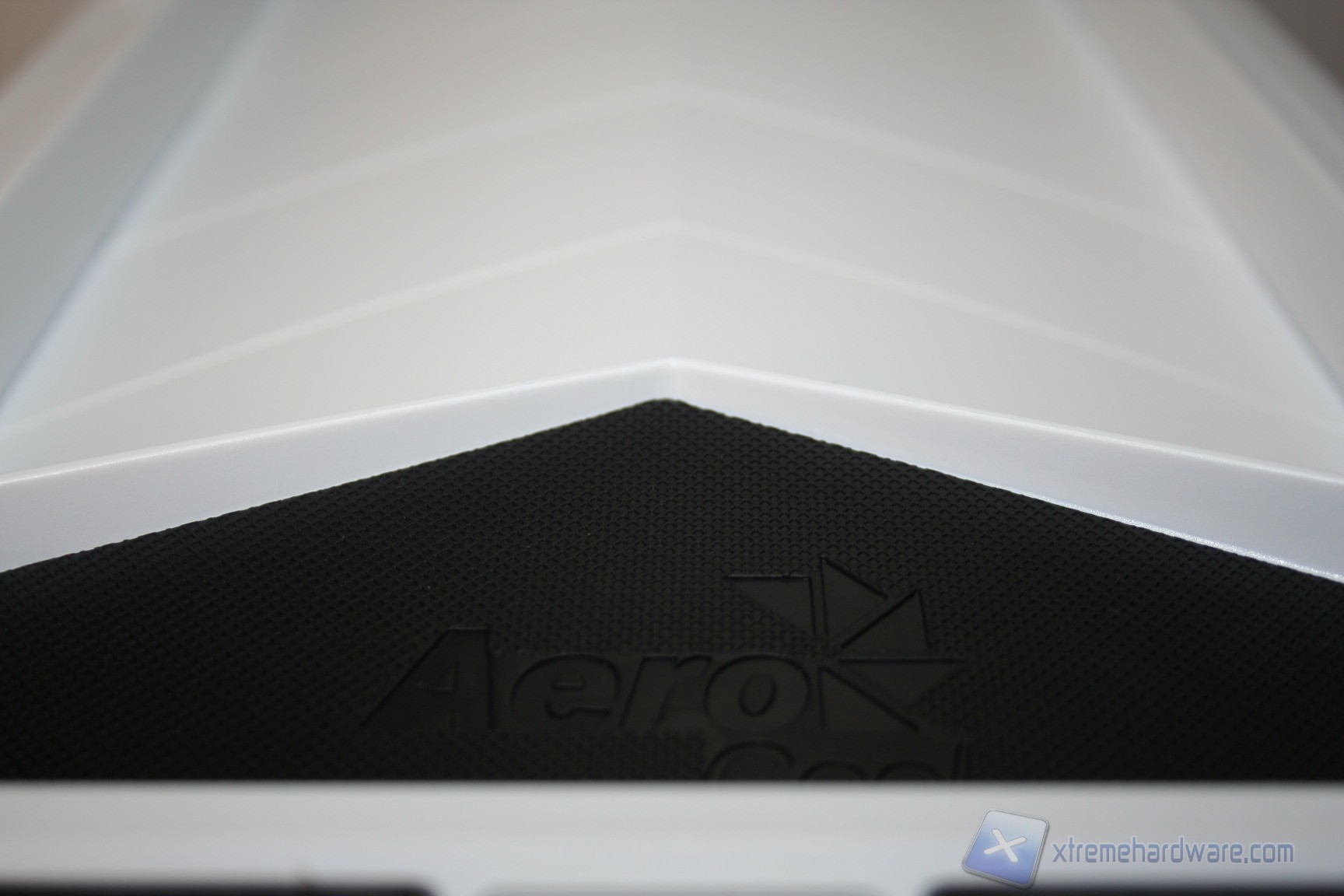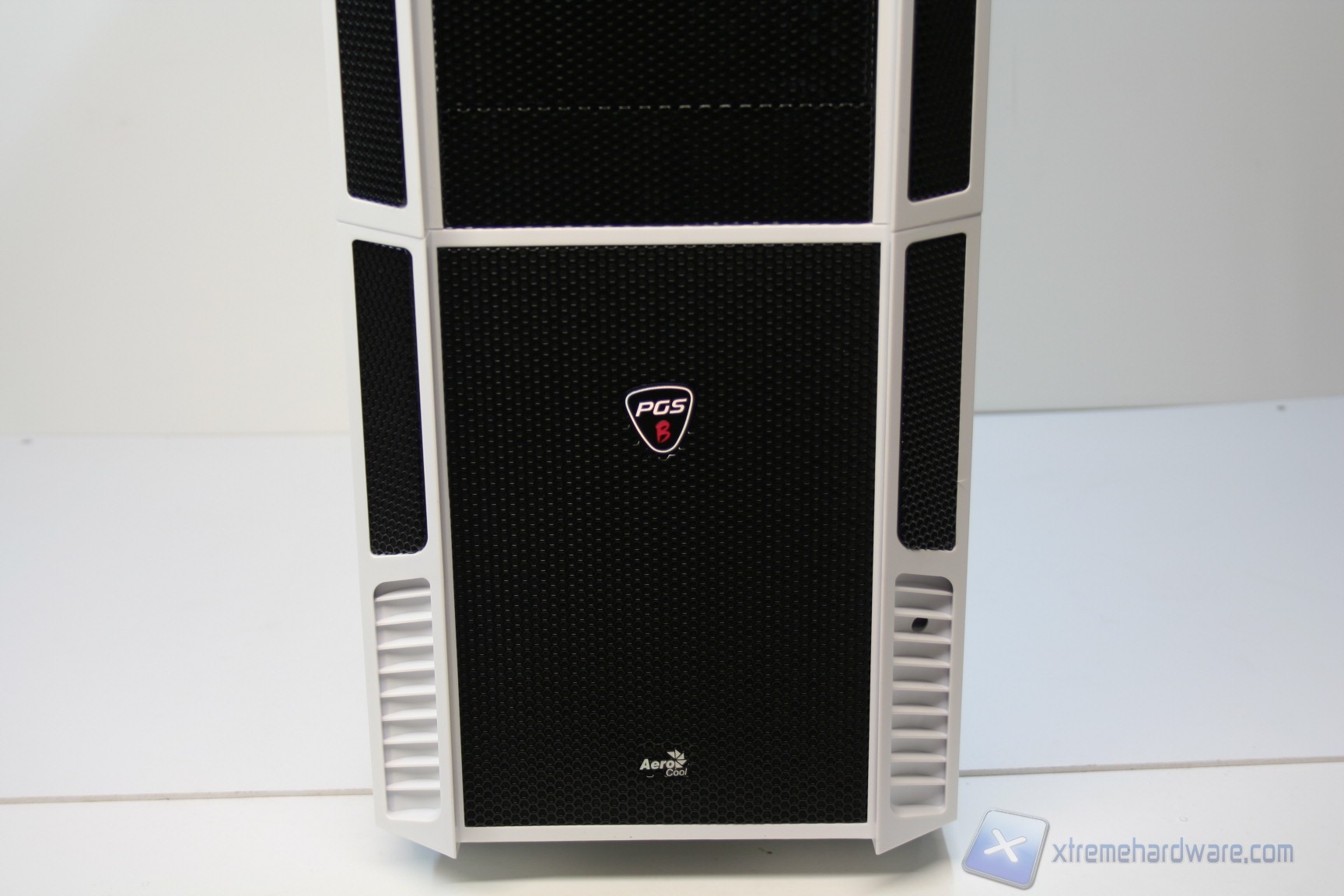 La parte frontale è caratterizzata da una struttura in plastica dura, resistente, di colore bianco e con i frontalini in mesh di colore nero. Sono presenti ben 6 slot da 5.25”, i due loghi PCS ed Aerocool in basso al centro e delle griglie forate di aerazione laterali, removibili all’atto dell’installazione. Nella parte superiore sono presenti il pulsante di accensione al centro in bianco, un ingresso eSATA, un connettore USB 3.0, tre connettori USB2.0, ingresso audio e mike in e due comodissimi fan controller per ventole laterali, capaci ognuno di regolarne fino a tre – per un consumo massimo teorico di 20W - ed infine l’indicatore di lettura degli hard disk e del funzionamento del PC, laterali, inseriti all’interno di due LED verticali che si illuminano dopo l’accensione. La base di questa struttura presenta una finitura satinata, molto gradevole e di assoluta qualità, specialmente per quanto riguarda le incisioni. Nella parte posteriore c’è uno spazio dove è possibile riporre oggetti, la cui base presenta il logo Aerocool ed è gommata, quindi con funzione antiscivolo e antigraffio. Il top in plastica è ovviamente removibile.