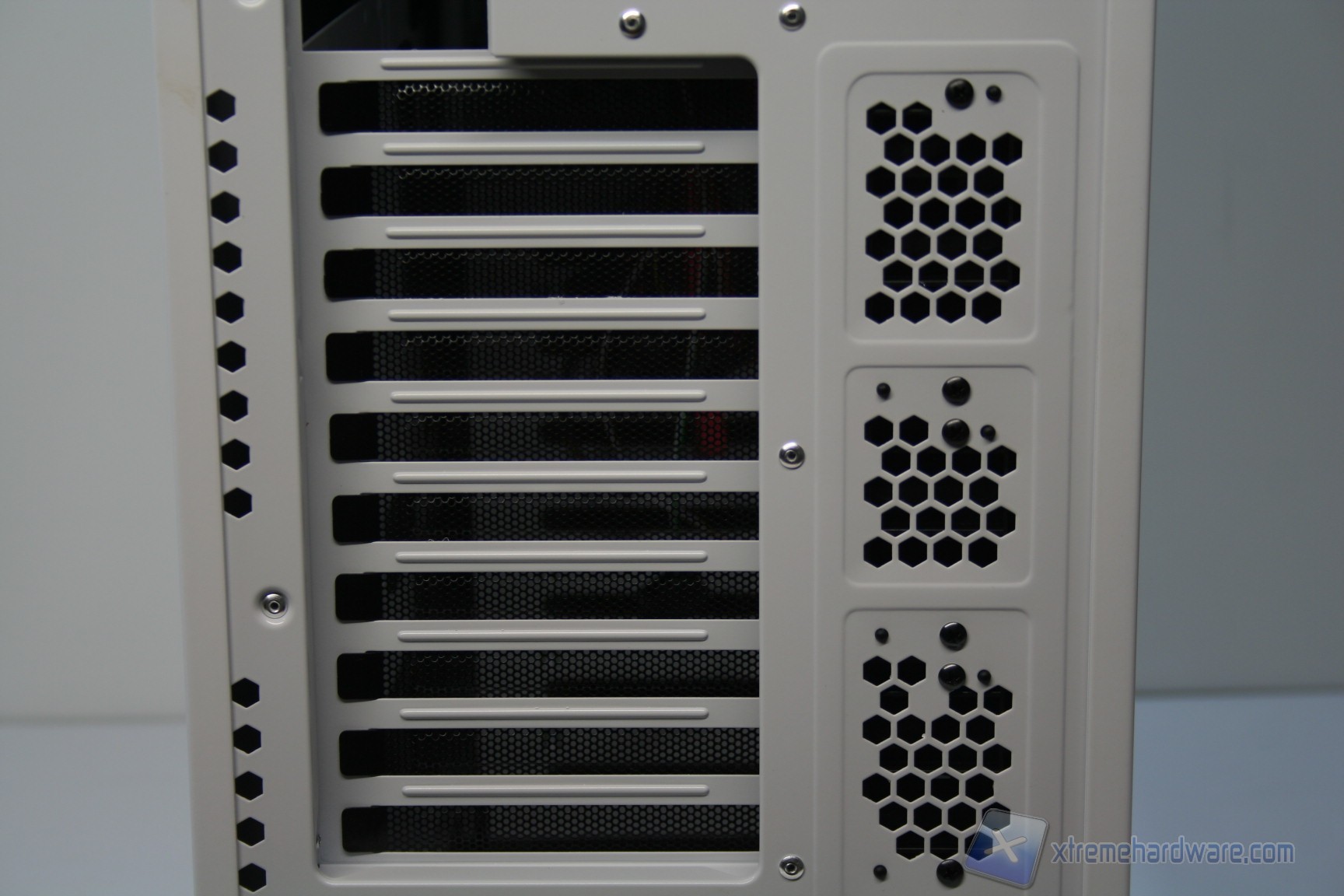 Gli slot PCI sono perforati per favorire l’aerazione, ma data l’assenza di una pressione positiva (il cabinet presenta lo stesso flusso sia in ingresso che in uscita), potrebbe esserci un parziale, e potenziale ricircolo dell’aria calda all’interno della GPU per via del fatto che l’aria tenderà ad uscire e poi rientrare dalle fessure superiori, creando un loop negativo di ventilazione. Fortunatamente, data l’elevata ventilazione e dato l’elevato numero di fessure, non si ha questo problema, che invece è presente in cabinet meno aperti e meno capienti. La compatibilità con sistemi molto potenti è davvero elevata perché sono presenti ben 10 slot di eventuali periferiche, caratteristica di modelli di schede madri aventi lo standard XL-ATX