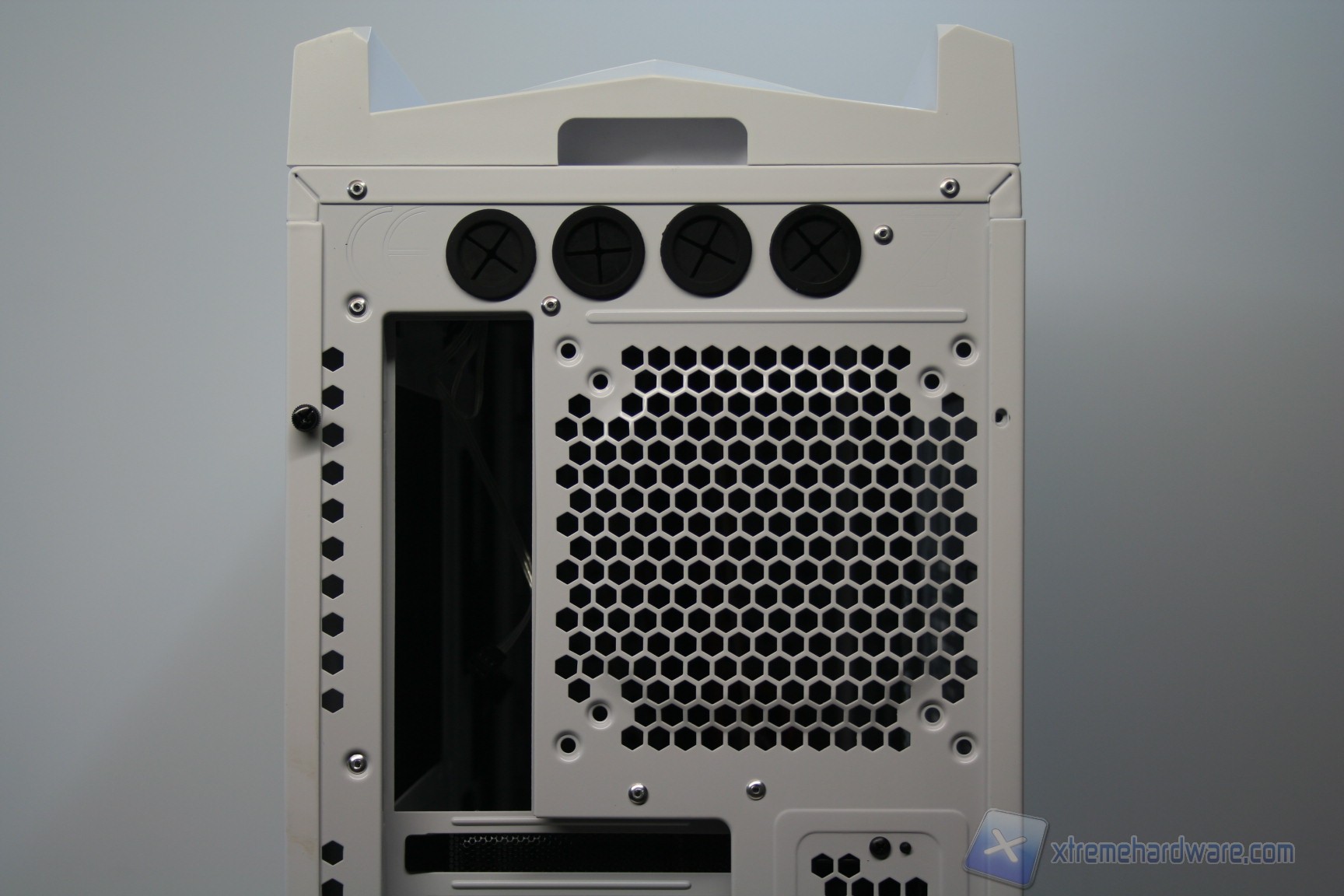 Posteriormente abbiamo una classica configurazione con alimentatore nella parte inferiore, slot di espansione che presentano aperture d’aerazione proprietarie con colorazione nera, tre piccole paratie perforate di ventilazione laterale, poi la ventola superiore da 120/140mmmm ed infine ben quattro fori circolari, gommati, per il passaggio dei cavi di sistemi a liquido. La classica copertura antistatica I/O è invece riposta in posizione standard.