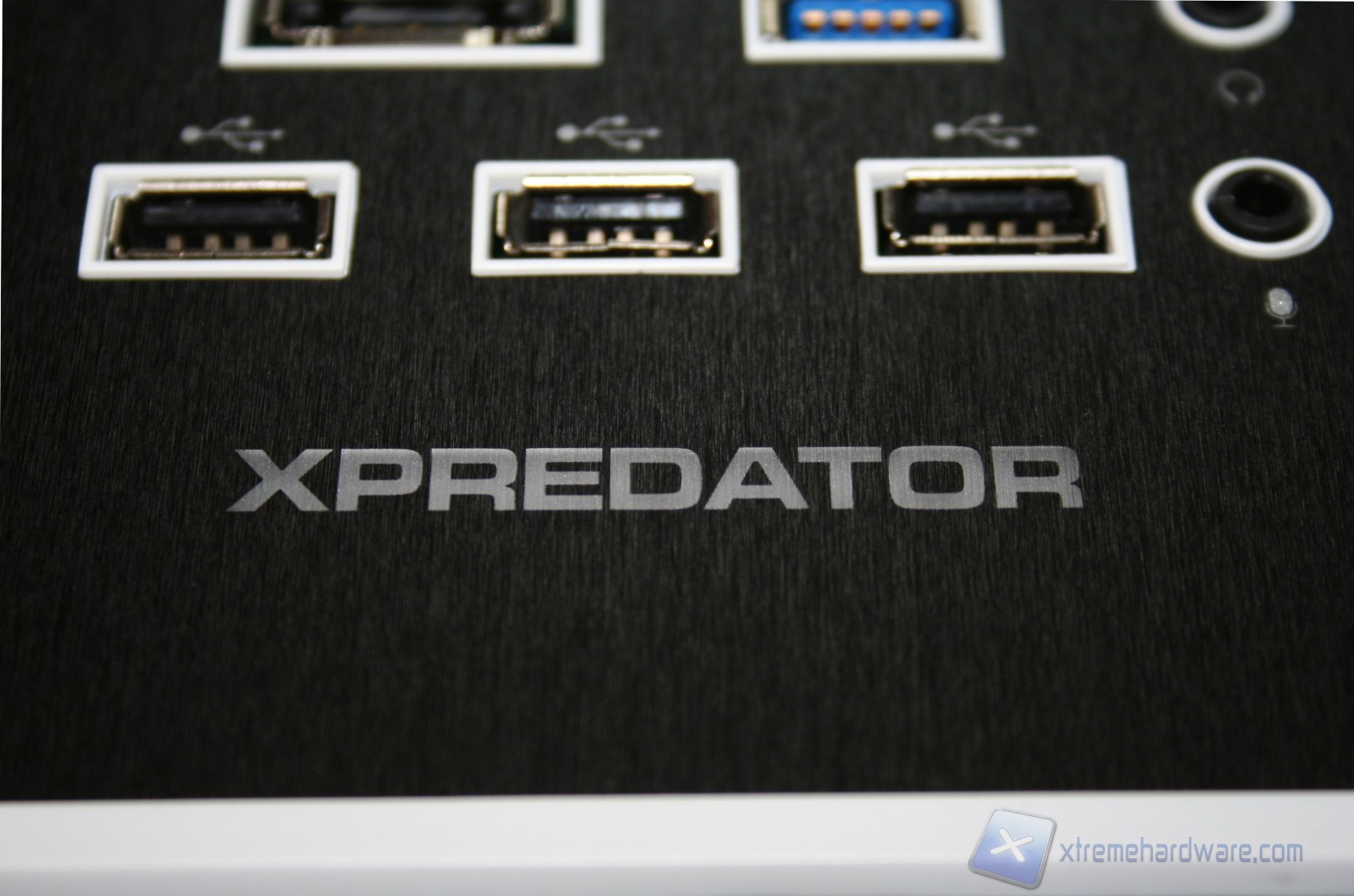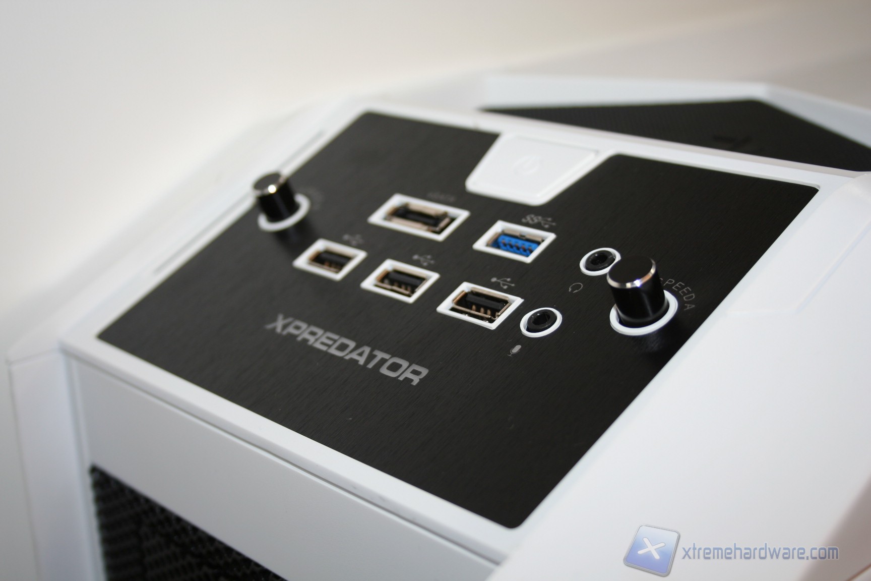 La parte superiore dell’XPredator presenta una caratteristica davvero peculiare ovvero una serie di fessure di aerazione la cui apertura e chiusura è selezionabile, tramite un pulsante laterale a scorrimento orizzontale. Data l’inclinazione dello stesso, l’operazione di apertura e chiusura risulta difficoltosa, però è apprezzabile la presenza di un sistema del genere. Il ruolo principale è di limitarne l’ingresso della polvere dall’alto quando il PC è spento, tuttavia contribuisce anche in modo significativo a rendere più aggressivo il cabinet.  Nella parte sottostante è presente una griglia di aerazione che può permettere l’installazione di due ventole da 120mm oppure di una singola ventola da 230mm, ventola che troviamo preinstallata installata.