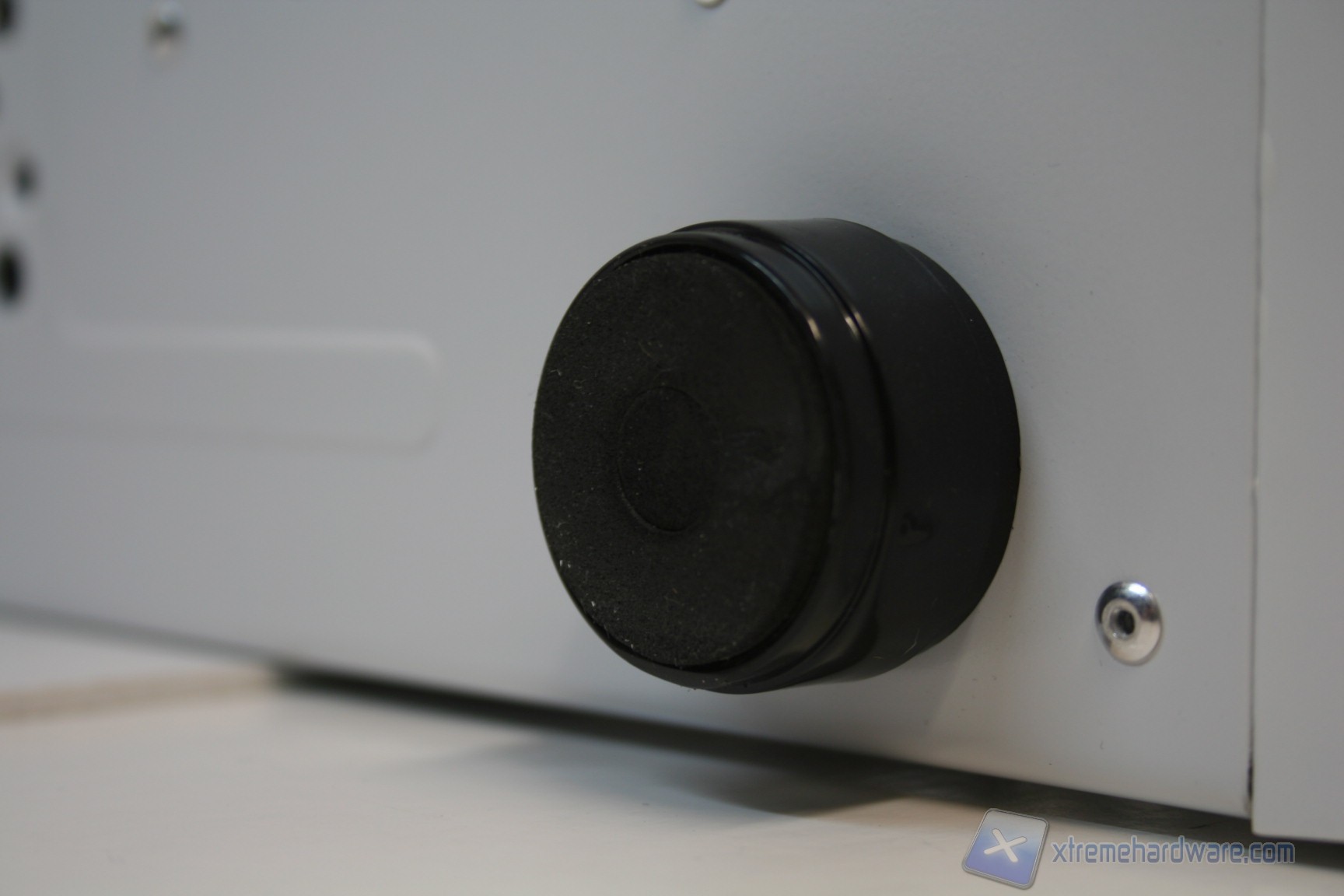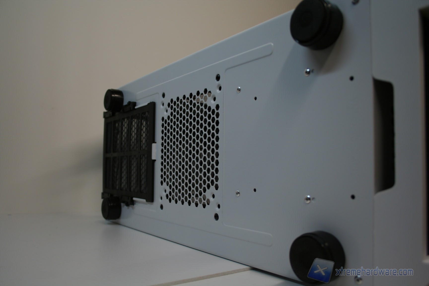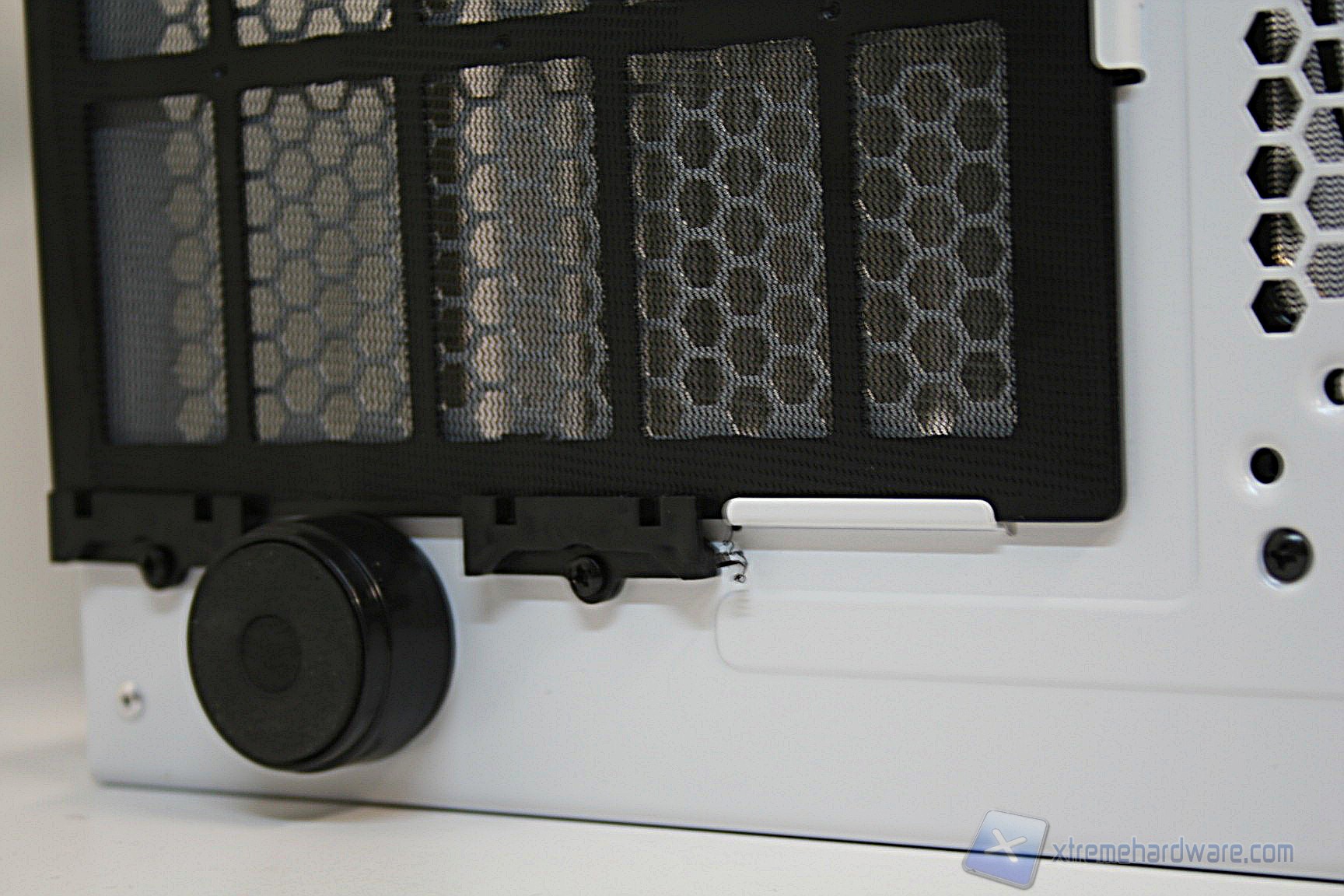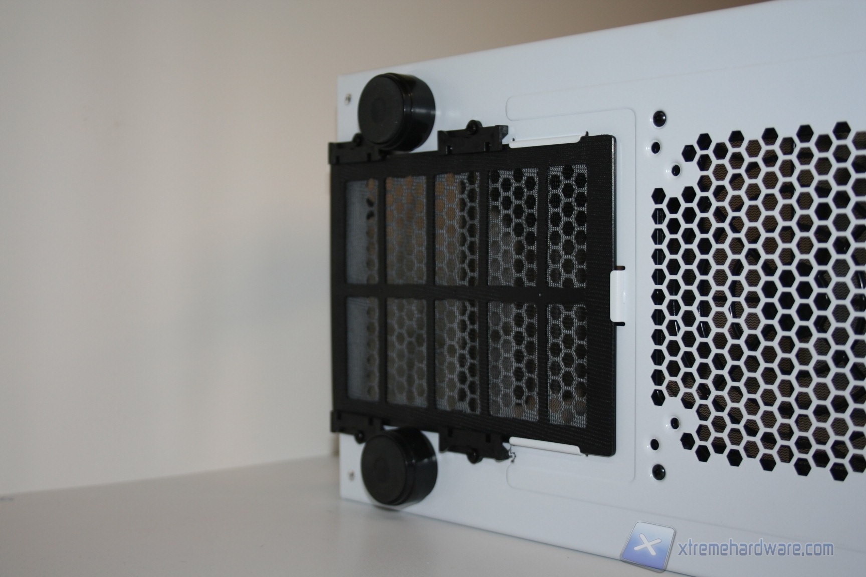 In basso abbiamo 4 ottimi supporti gommati antivibrazione, ma un solo filtro antipolvere specifico per l’alimentatore, poi una paratia per l’installazione di una ventola da 120 o 140mm, nella parte inferiore ed interna del cabinet, in immissione. Quest’ultima, posizionabile nella parte inferiore ed interna del case, presenta un filtro con un sistema di blocco a scatto, molto pratico. Non è possibile montare rotelle per lo spostamento del case.