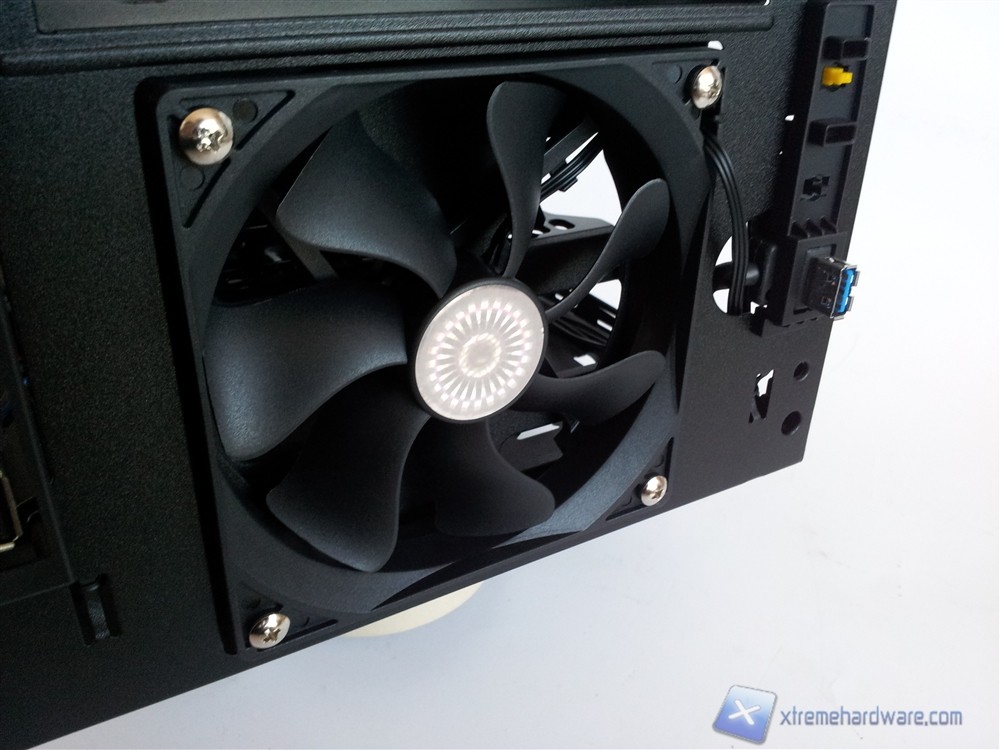 Sarà possibile installare una ventola da 120mm tra la mainboard e il cestello degli hard disk: Cooler Master mette a disposizione delle particolari viti in plastica dura che permetteranno di attaccare la ventola al cestello senza l'utilizzo di un cacciavite.
