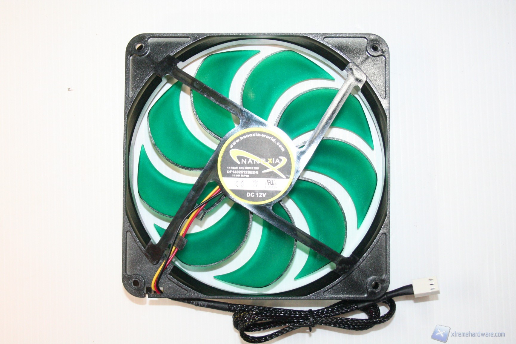 La dotazione potenziale del case è buona e a default è dotato di due ventole da 120mm DF1202512SELN da 1300RPM, DC12V di fabbricazione Nanoxia, quindi proprietarie. Presentano delle pale di colorazione verde trasparenti, aventi un numero maggiore di pale rispetto al normale e fanno parte della serie Deep Silence. Sono molto silenziose, rimandiamo ad un futuro articolo dedicato, nel roundup, per l’analisi tecnica, fermo restando la disponibilità di Nanoxia per i test di carico.