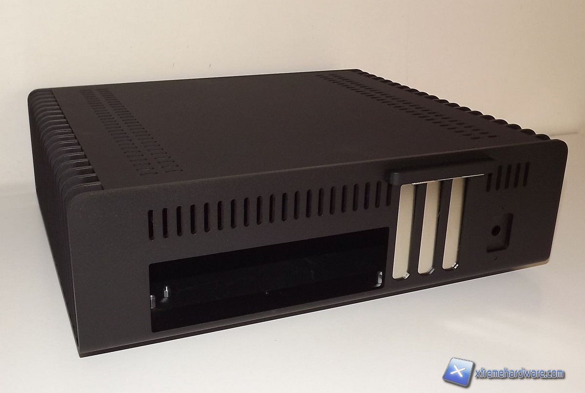 Nella parte posteriore spiacca un'ampia apertura di forma rettangolare nella quale sarà inserita la mascherina di I/O della mainboard, un foro per il jack DC Power. Nella parte destra si nota la predisposizione per ben tre slot per inserire eventuali schede PCI o PCI-Express di tipo Half-Height come ad esempio una scheda grafica di tipo Low Profile (meglio se passiva, al fine di preservare la silenziosità del PC). La scheda può anche occupare più di uno slot, questo fa in modo che le scelte per inserire una eventuale VGA sono davvero ampie. Immediatamente sopra la mascherina di I/O della scheda madre e sopra il foro per il jack DC Power abbiamo 25 fessure che permettono una maggiore areazione all'interno dello chassis.