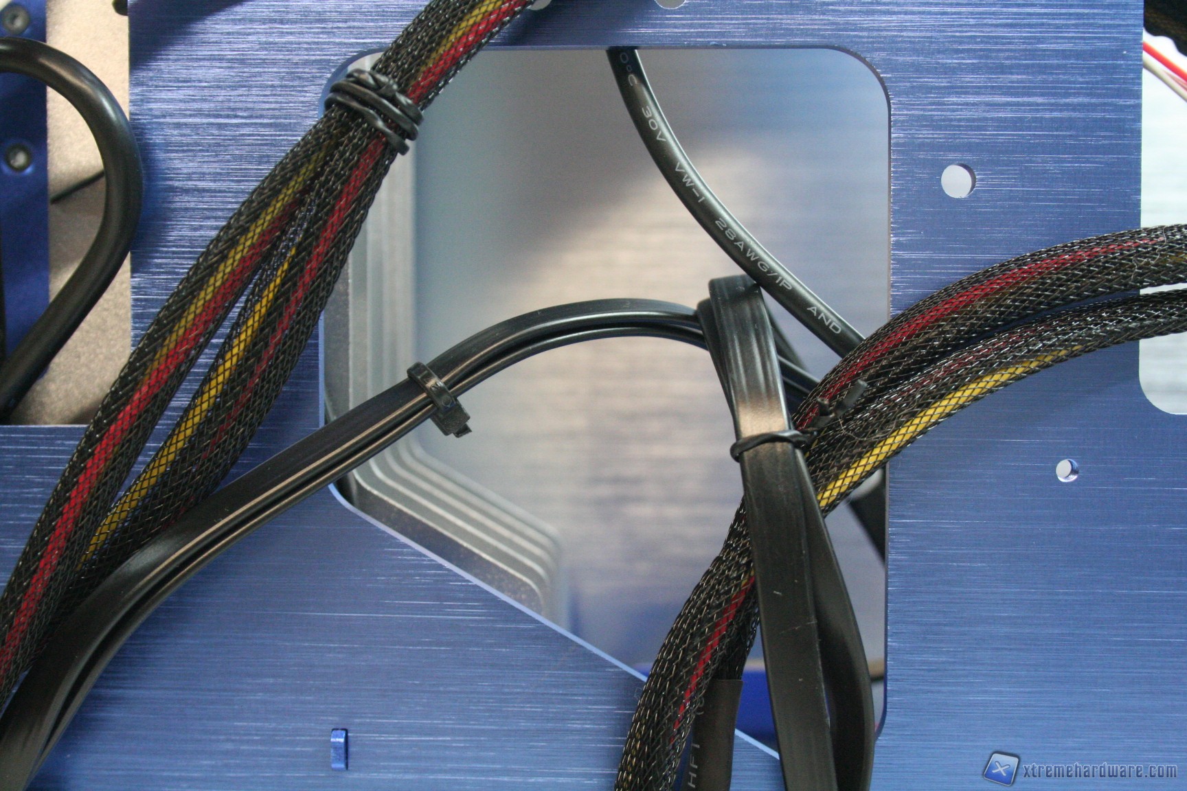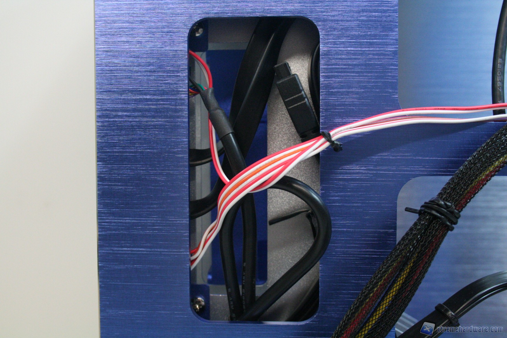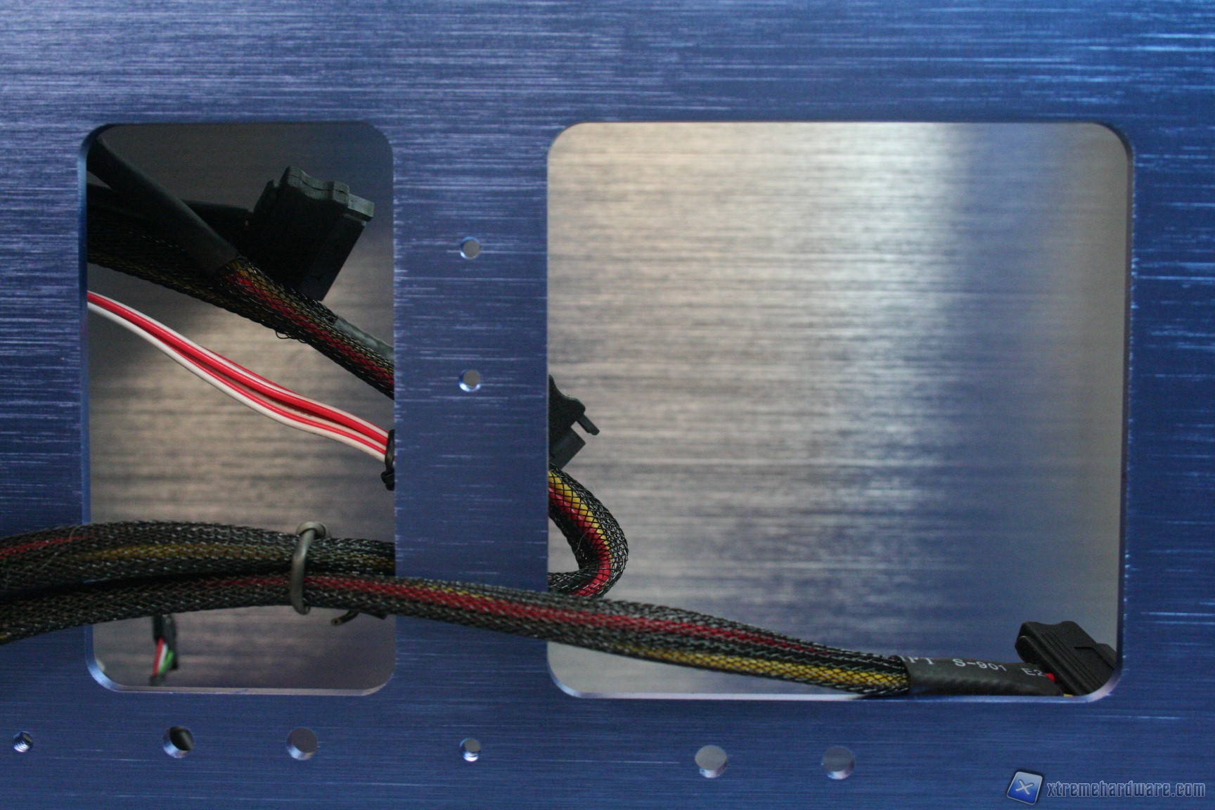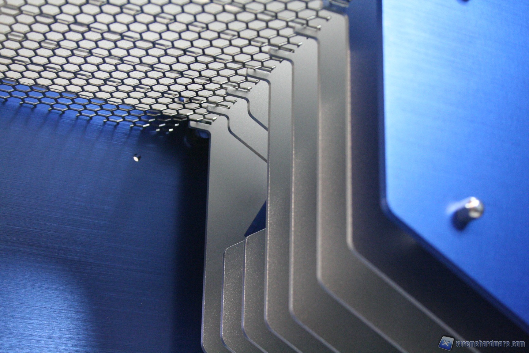 Il layout interno è moderno, senza esagerare in dimensioni; questo comporta però che la tolleranza in profondità per dissipatori aftermarket e lo spazio superiore per il cablaggio sono limitati. Presenta elementi innovativi tra cui prima di tutto il sistema di installazione dei dischi rigidi, leggermente problematico qualora i plate non fossero riposti correttamente, ma molto rigido e soprattutto, tool-less. L’orientamento della scheda madre è classico ATX, il posizionamento dei bay per gli hard disk è nella parte laterale sinistra e frontale, con orientamento orizzontale. E’ standard anche il posizionamento delle periferiche da 5.25” anche se c’è un inclinazione verso il basso particolarmente accentuata, possibile grazie ad un sistema di blocco removibile. Non c’è separazione fra i diversi scompartimenti, che porterebbe ad un isolamento a livello termico, data la struttura aperta. La colorazione interna è completamente blu/grigia e non sono presenti guaine in gomma per il passaggio dei cavi.