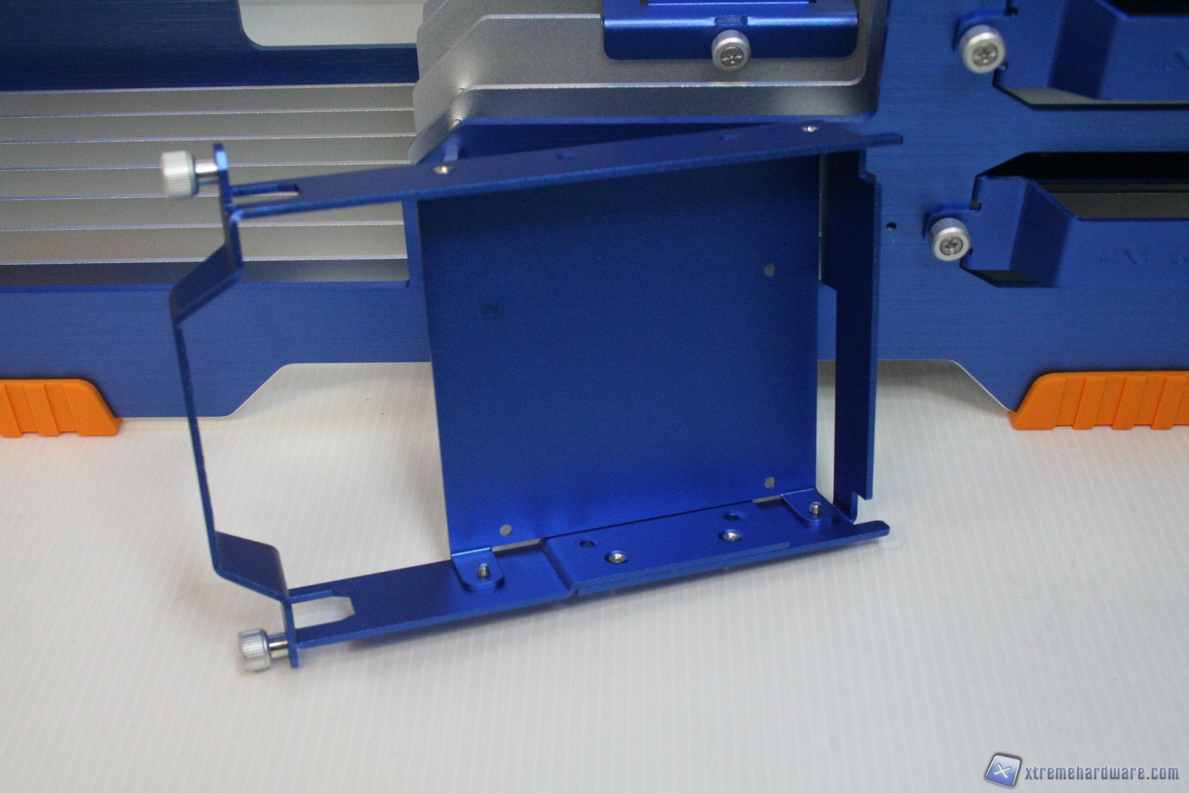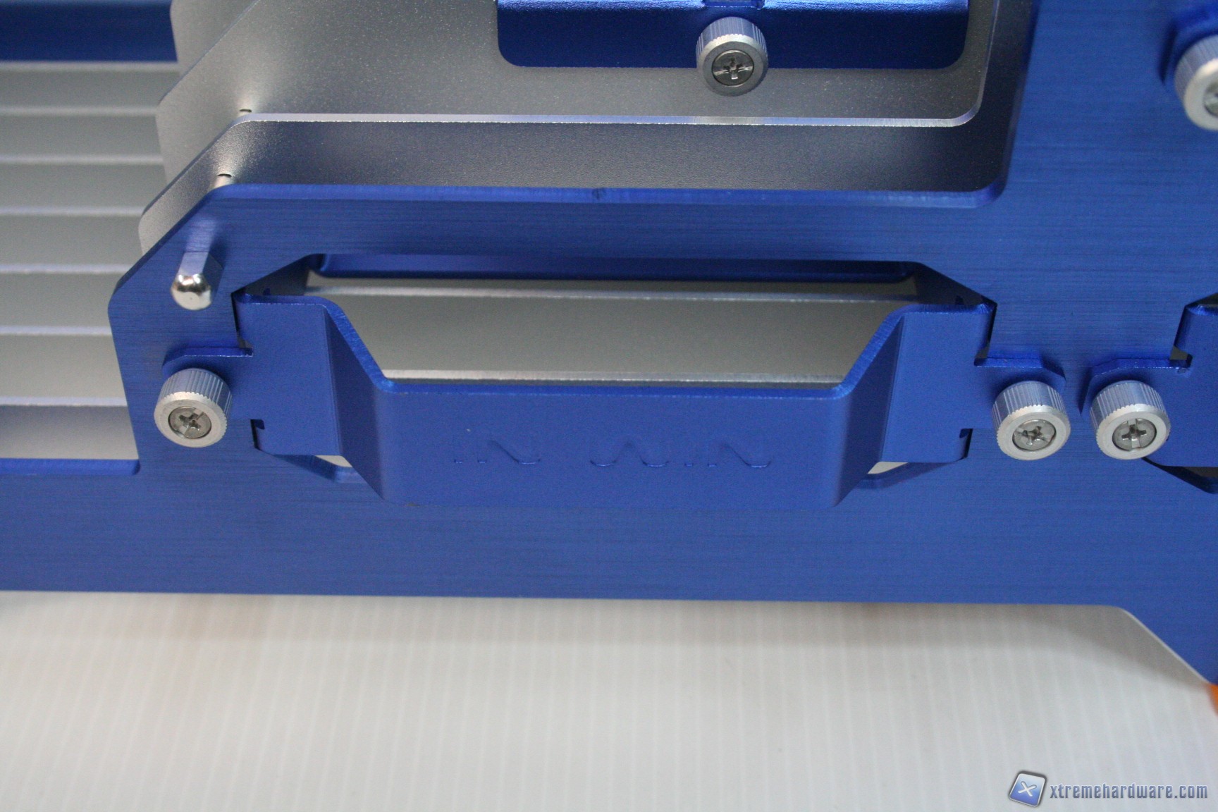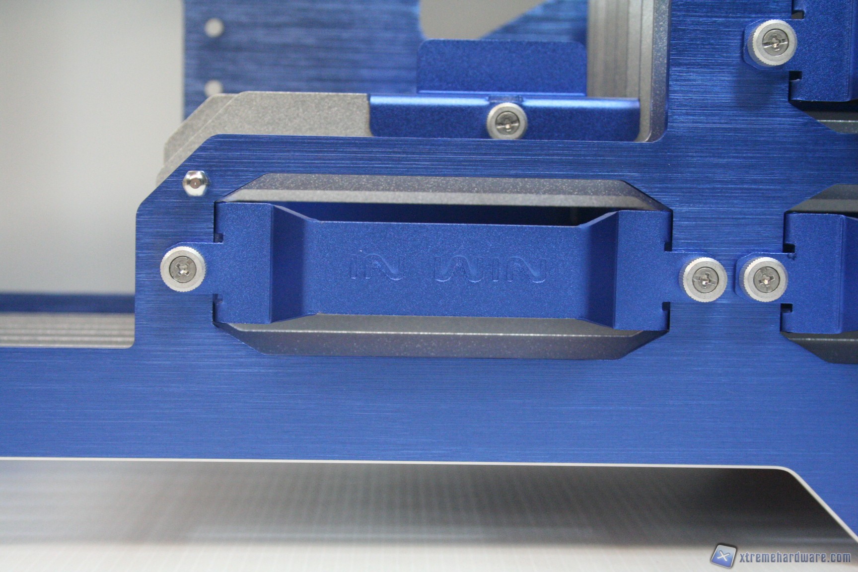 E’ possibile installare due ventole da 120mm quindi la compatibilità risulta fortemente limitata, però bisogna precisare che a differenza delle altre soluzioni, essendo questo un modello completamente aperto, la dissipazione sarà già massima in partenza per la CPU. Per la GPU il discorso cambia e per via di alcune ragioni: l’assenza di ventilazione dedicata qualora non fosse installata la ventola frontale da 120mm e la struttura ATX, che porta quindi ad un riscaldamento del PCB posteriore della VGA, cosa che non succede con modelli sullo stile Silverstone. Facciamo presente che un simile accorgimento è stato invece adottato nell’IN WIN D-Frame. Come elementi caratteristici sono presenti quattro sospensori gommati di colore giallo alla base ed ovviamente la colorazione blu dei plate centrali, che contrasta con quella in grigio degli elementi laterali dei plate stessi. In breve vengono creati dei contrasti cromatici che dal vivo certamente portano ad un fortissimo impatto estetico. Qualora fossero stati scelti dei toni diversi però ad esempio il nero o bianco, assieme all’arancione del modello presentato al Computex oppure rosso fegato, probabilmente l’impatto sarebbe stato più aggressivo, e forse appropriato data la struttura. Facciamo presente che sono presenti due plate laterali con un incavo che funziona da maniglia. Sarà possibile sollevarlo tramite queste maniglie grazie alla grandissima rigidità complessiva del telaio.