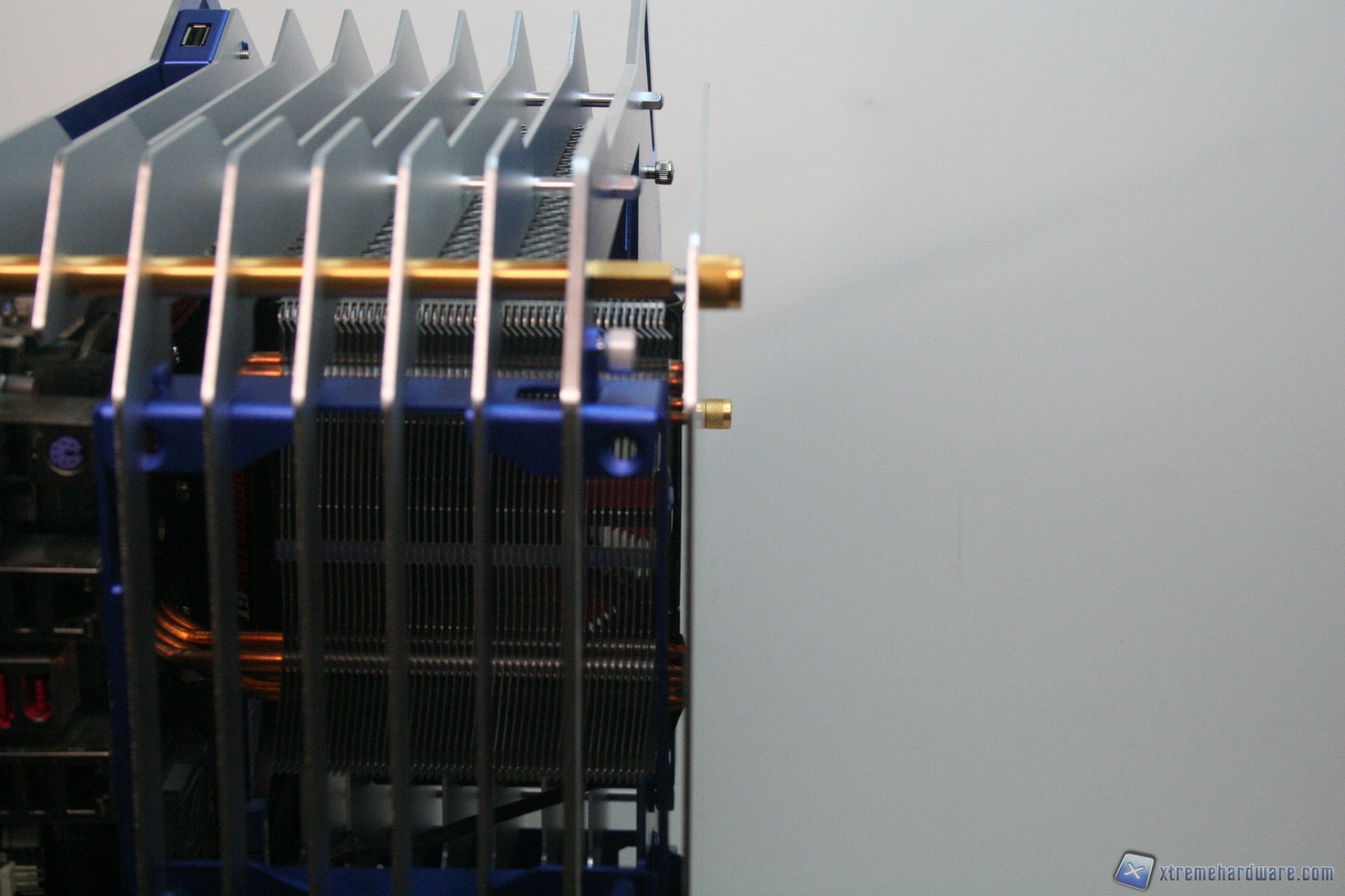 C’è da dire che la parte posteriore però permette un cablaggio discreto anche se avremmo apprezzato uno spessore laterale sinistro maggiore, sui 175mm minimo. Lo spessore è leggermente maggiore rispetto allo standard ma non per via di una predisposizione stock bensì di una collocazione delle paratie sul momento, adattando la lunghezza delle barre di sostegno trasversali, che si possono regolare, anche se non è previsto sul manuale. Potrebbe succedere che ci sia una collisione delle scudature superiori delle heatpipes con dissipatori alti 163-165mm, vi mostriamo una fotografia di un modello certamente non impegnativo, il TRUE SPIRIT 120:
