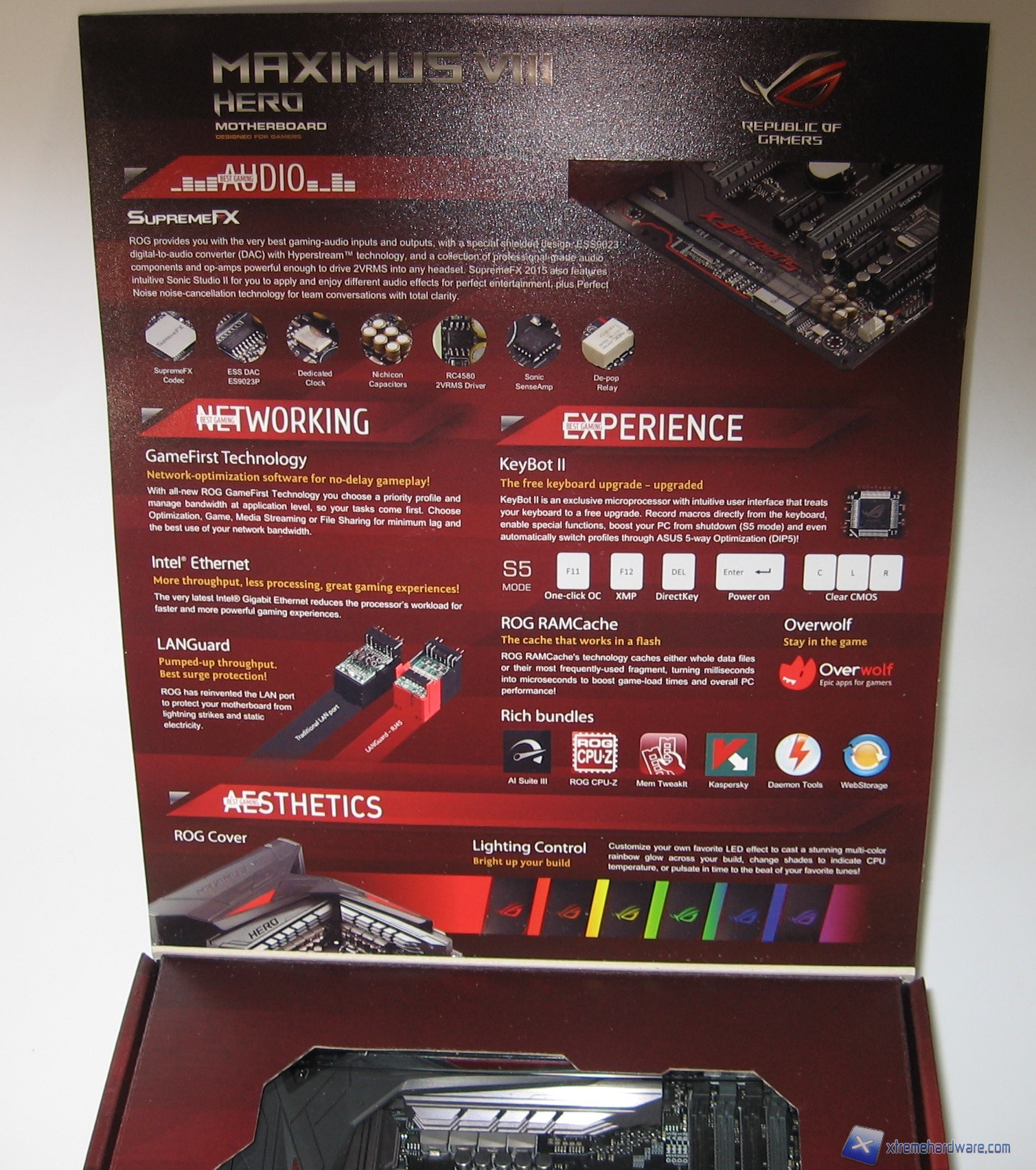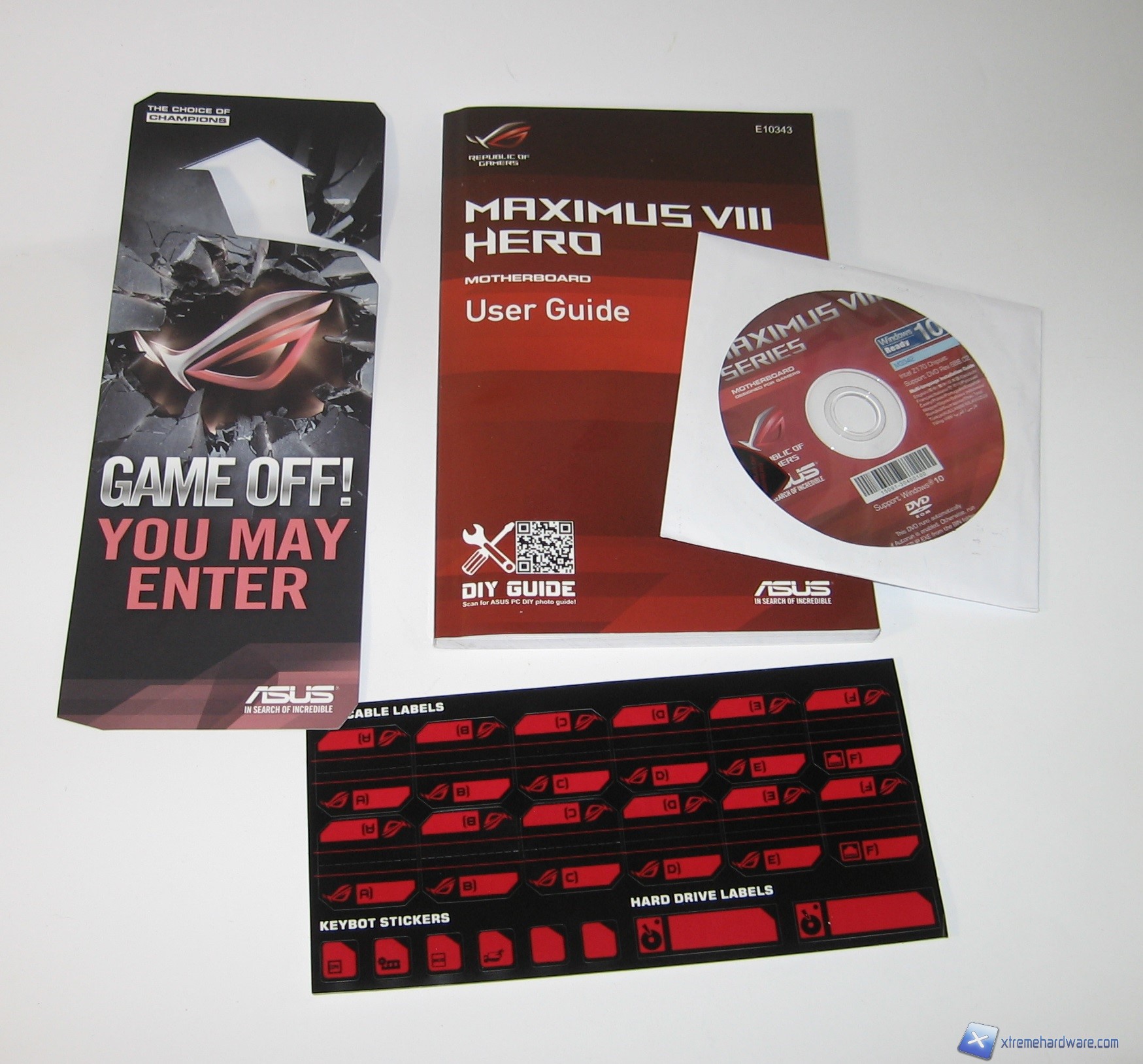 Il bundle è ridotto ma in linea con il prezzo offerto per accaparrarsi la Maximus VIII Hero. Avremmo preferito almeno una seconda porta Ethernet oppure in alternativa una connessione WiFi. Sono presenti le etichette adesive che aiutano ad identificare le varie cavetterie. E’ presente anche lo Stickers ROG ed un simpatico ed utile cartellino da appendere alla maniglia fuori alla porta per non esser disturbati. Il manuale è stampato nella sola lingua inglese ma comprensibile perché arricchito da immagini e schemi. Il DVD contenente i drivers ed il software proprietario permette di completare la fase di installazione e personalizzazione del sistema operativo. Nel bundle sono presenti anche 6 Cavi Sata, un bridge per lo SLI, la mascherina I/O, il Q-Connector per semplificare le operazioni di smontaggio e una staffetta in plastica per agevolare e rendere sicura la delicata operazione d’installazione della CPU per evitare di danneggiare i micro-pin del socket.